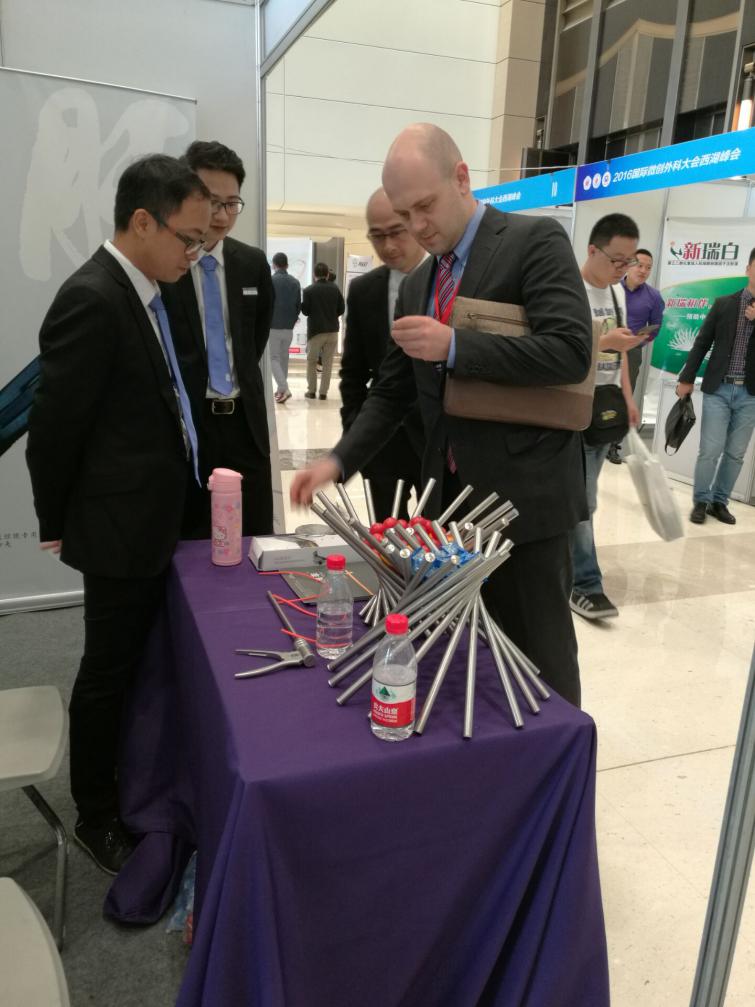 會議茶歇期間,我公司展位吸引了眾多專家醫(yī)師們的關(guān)注,其中有來自英國皇家英格蘭外科學(xué)院的專家代表前來了解我公司產(chǎn)品---速豐?可吸收止血結(jié)扎夾,現(xiàn)場我司工作人員欣然以嫻熟的英語為其做介紹與產(chǎn)品演示,我公司產(chǎn)品的特點(diǎn)及優(yōu)勢得到了英國皇家英格蘭外科學(xué)院專家的認(rèn)可與肯定!